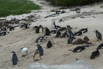 Past Fish Hoek and Glencairn, we reached one of the most awaited stops on our tour and one of the main reason people come to Cape Town - Boulders Beach. After a short walk within a neighborhood of Simon's Town, we reach the visitor center and the boardwalk, which if you follow all the way down to the end, will lead you to a resident African penguin colony. These penguins were everywhere. And so were the tourists, eager to take witness them. Some of the penguins were resting in groups on the sand and in the enclosed, protected bays comprised by the labyrinth of half-billion-year-old granite boulders, while others entered and exited the water. We were even lucky enough to see some baby penguins, with their mothers brooding. They tend to hide inside of the thick bushes lining the beach to hatch and raise their young. Showing no fear or remote regard for the hundreds of humans staring at them, they continued their activity while we spent about half an hour observing them. Incredible.