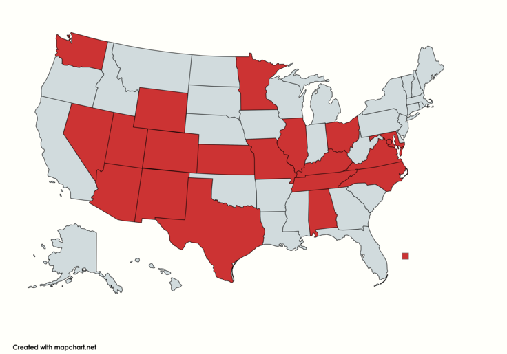- Alabama, Arizona, Colorado, DC, Illinois, Kansas, Kentucky, Maryland, Minnesota, Missouri, Nevada, New Mexico, North Carolina, Ohio, Tennessee, Texas, Utah, Virginia, Washington, Wyoming