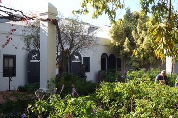 The winery was truly gorgeous with its reflective pool, vines growing along the entire estate, and goats living out front. Rather than taking us to the next winery, we decided to check out the town of Stellenbosch first. The university town, with its quaint main road, large student body, red roofs, and mountainous background had a striking resemblance to my college town of Boulder, CO. Cute artist shops and cafés lined the roads, surrounded by student housing, intertwined with fancy white columns and churches.